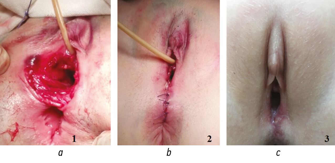 Fig. 4. View of the external genital organs of a 4-year-old girl at the stages of treatment. а — View before surgery; b — view after surgery; c — view four months after surgery