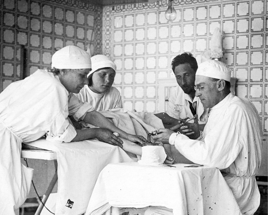 В начале XX в. в России интенсивно развивается другая медицинская специальность — ортопедия. Ее основоположником по праву считается Генрих Иванович Турнер (1858–1941), организовавший в Санкт-Петербурге в 1900 г. в Императорской Военно-хирургической академии первые в России кафедру и клинику ортопедии. Им же в 1932 г. на базе детского приюта для калеченых и паралитиков «Синий крест» был создан Научно-исследовательский институт детской ортопедии, которому в дальнейшем было присвоено его имя [12]. В институте много внимания уделялось лечению последствий травм у детей и их профилактике. Написанное Г.И. Турнером «Руководство к наложению повязок» [13] выдержало пять изданий и служило настольной книгой для травматологов и ортопедов.