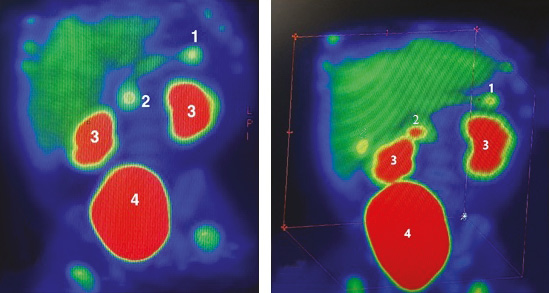 Fig. 1. Combined positron emission tomography and computed tomography with 18F-DOPA for the patient. 1 — a focus in the tail of the pancreas, 2 — a focus in the head of the pancreas, 3 — accumulation of radiopharmaceutical in the kidneys, and 4 — accumulation of radiopharmaceutical in the bladder