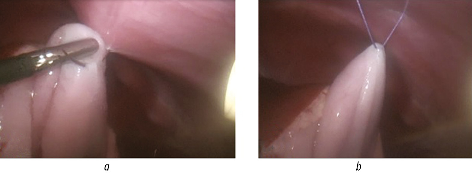 Fig. 2. Fixation of the stomach to the anterior abdominal wall with traction sutures: a — process of fixing the large curvature of the stomach to the anterior abdominal wall and b — traction seam is completed