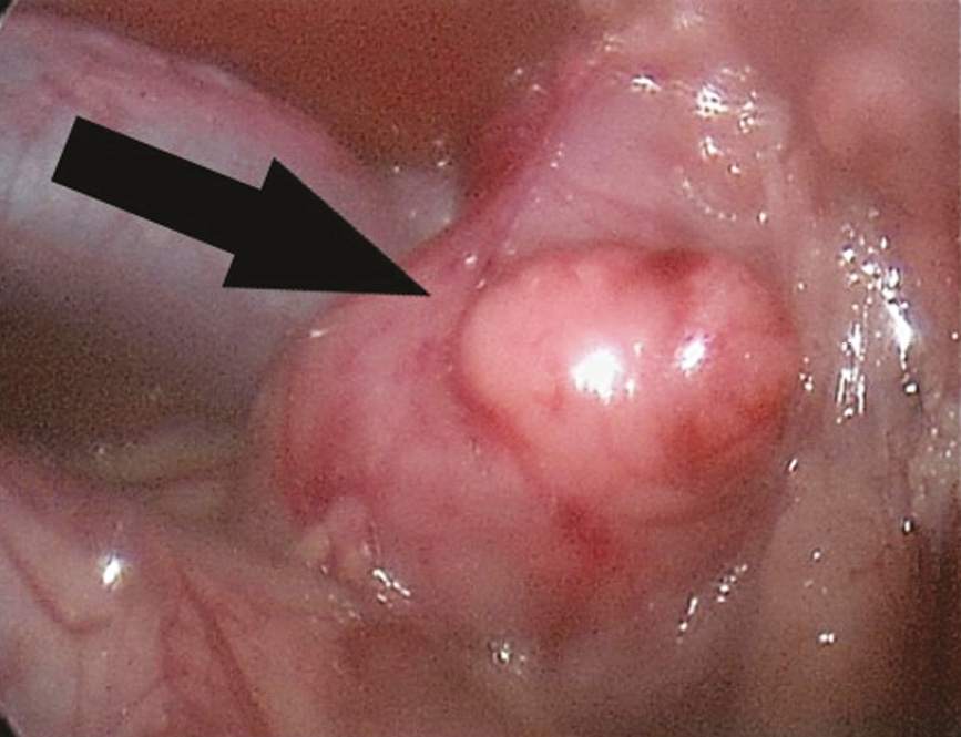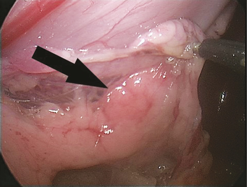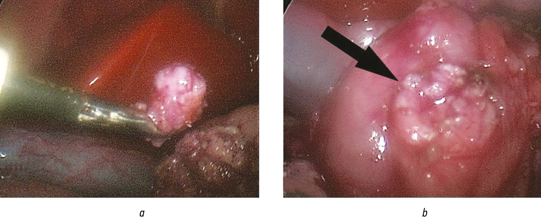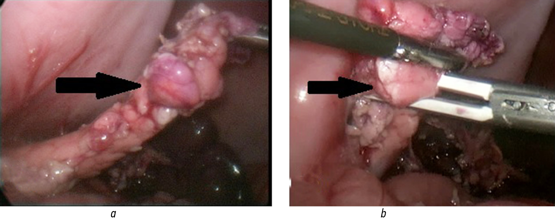 Резецированный участок был удален из брюшной полости через 5-мм троакар и отправлен на срочное гистологическое исследование.