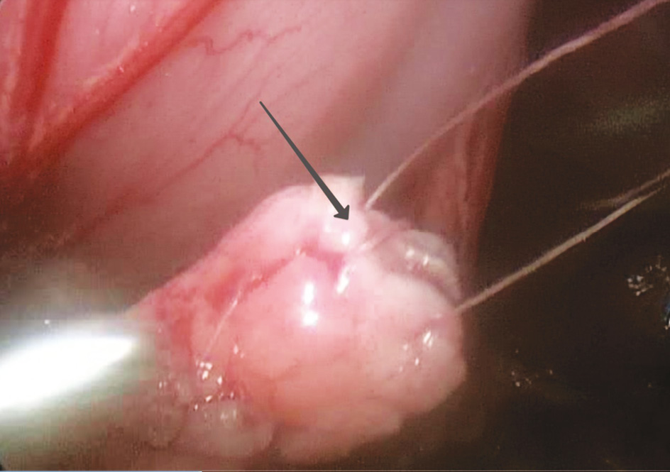 В возрасте 1 мес. 20 дней ребенку выполнена операция: лапароскопическая резекция хвоста поджелудочной железы (15 %) и резекция очага головки поджелудочной железы. Техника операции: разрез под пупком, с помощью иглы Вереша создали карбоксиперитонеум (давление 9–11 мм рт. ст, с потоком 2 л/мин), установлен 5-мм троакар с 30° оптикой. Слева и справа от пупка по срединно-ключичной линии установили 3- и 5-мм рабочие троакары. Для доступа в полость малого сальника вскрывали желудочно-ободочную связку с использованием биполярной коагуляции аппаратом Ligasure. Мобилизованный желудок по большой кривизне фиксировали к передней брюшной стенке временными тракционными швами (рис. 2).