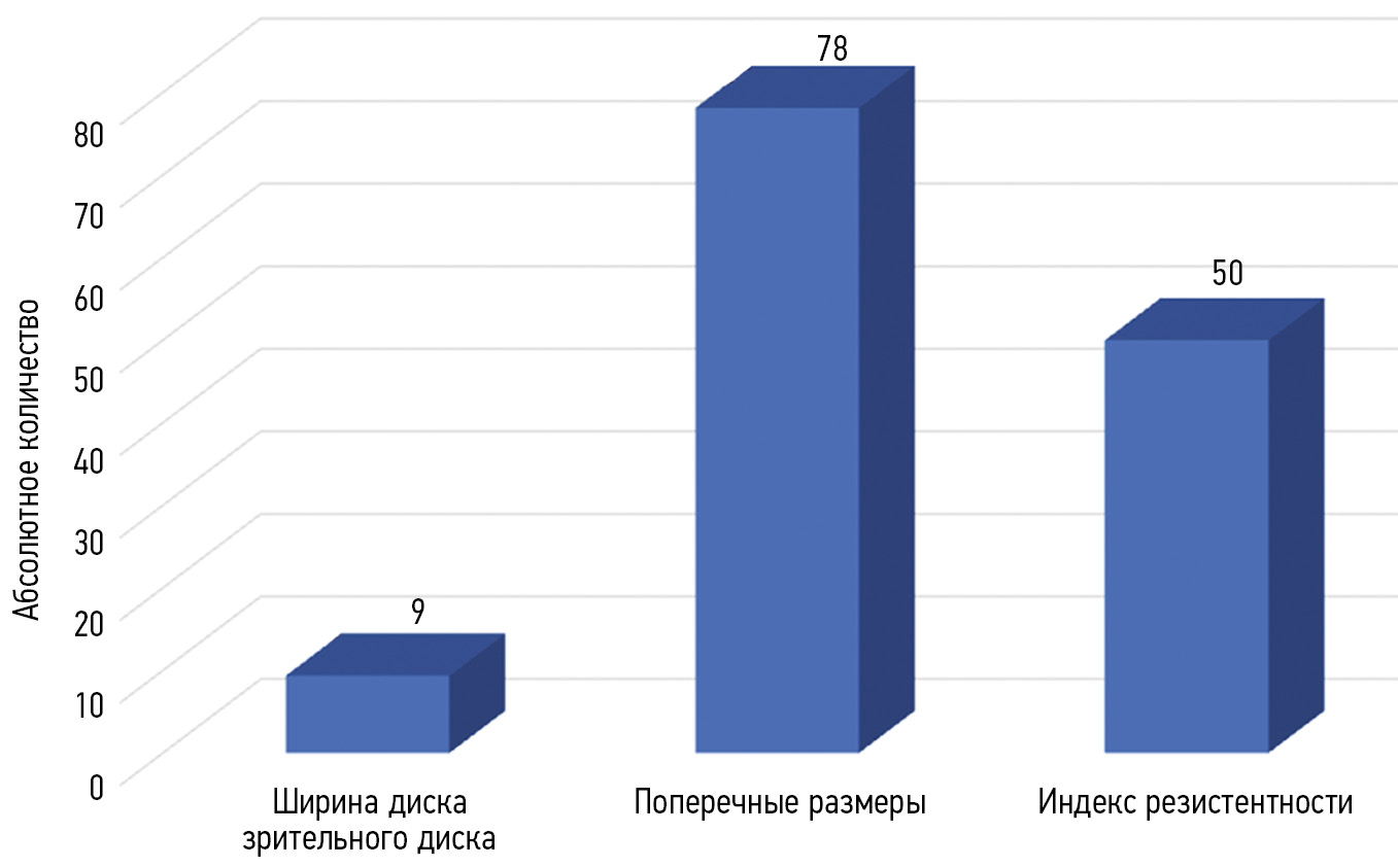 Оценку церебральной перфузии и диагностику синдрома внутричерепной гипертензии с помощью УЗН используют в 72 % случаев, ежегодно проводится 51 (0–216) нейросонография. В 78 % случаев делают поперечные замеры больших полушарий и боковых желудочков головного мозга, в 50 % оценивается индекс резистентности средней мозговой артерии и только в 9 % исследуется диаметр диска зрительного нерва (рис. 3).