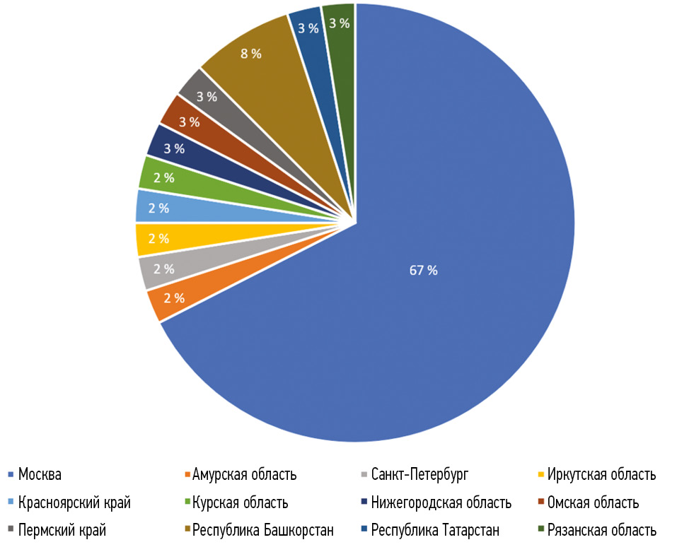 По данным сайта Министерства здравоохранения Российской Федерации (https://edu.rosminzdrav.ru), на территории России на данный момент доступен 41 курс по применению методов УЗ-визуализации в анестезиологии и интенсивной терапии, при этом большая часть из них проводится в Москве (рис. 7).