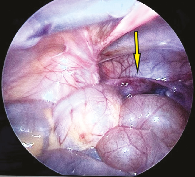 Рис. 6. Эндоскопическая картина при ревизии органов малого таза. Стрелка указывает на левостороннюю латерофлексию матки