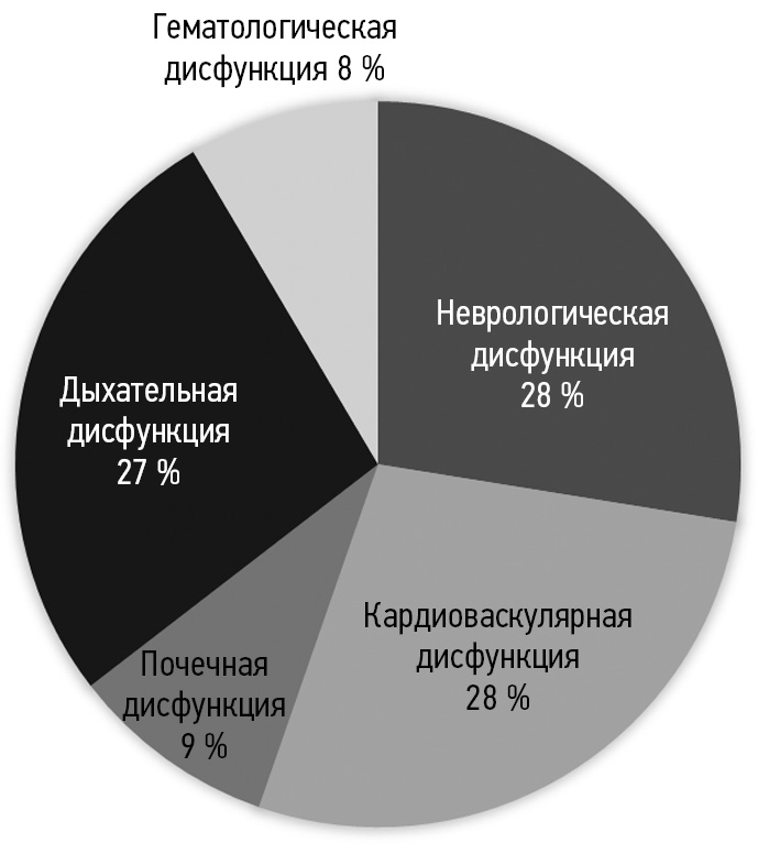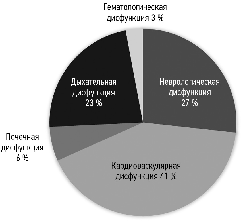 У пациентов с летальным исходом преобладало поражение сердечно-сосудистой системы с развитием кардиоваскулярной дисфункции, которая имела место в 41 % случаев, в то время как дисфункция нервной системы была выявлена лишь в 27 % случаев (рис. 3).