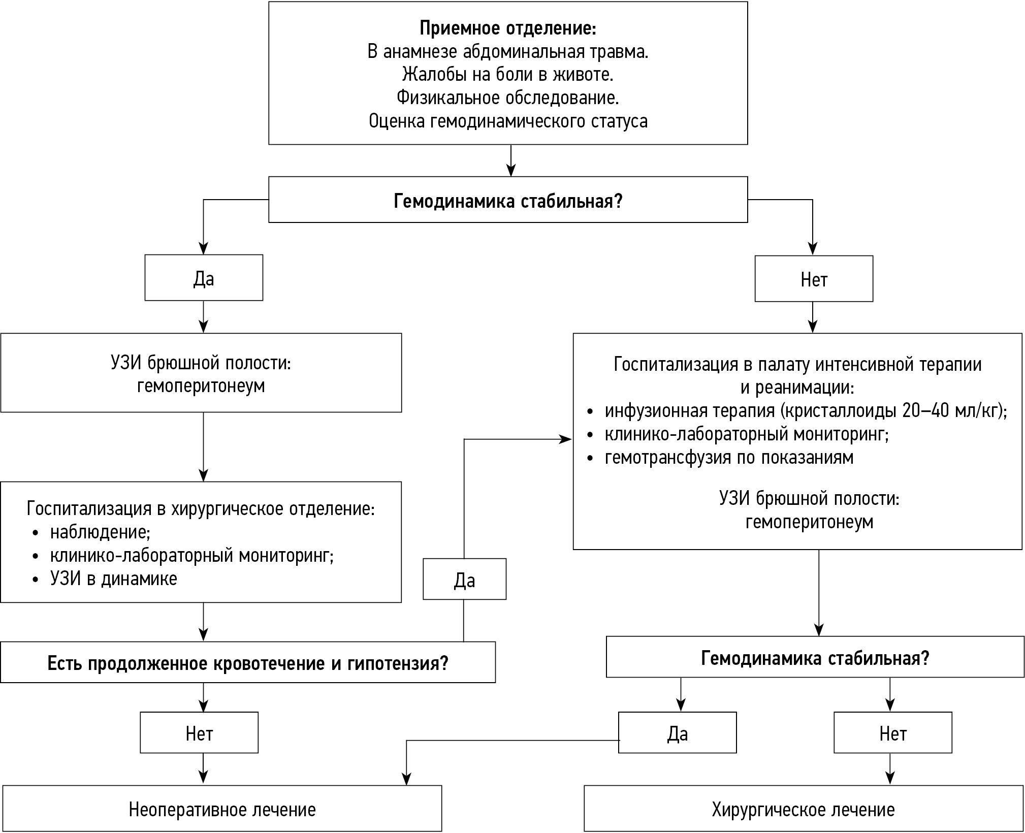 При повышенном шоковом индексе дети получали инфузионную терапию кристаллоидными растворами в объеме 20–40 мл/кг; при болюсном введении изотонической жидкости и сохранении гипотензии — гемотрансфузию в объеме 10–15 мл/кг. Переливание компонентов крови также осуществлялось при уровне гемоглобина менее 70 г/л. Для контроля объема гемоперитонеума проводилась абдоминальная эхосонография каждые 2 ч в течение 6 ч от момента поступления, затем каждые 6 ч в течение суток и в последующем — 1 раз в день. Алгоритм ведения пациентов представлен на рис. 1.
