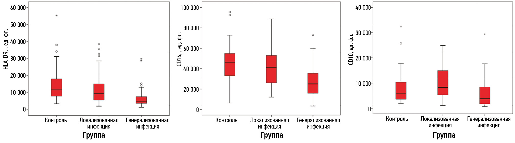 В контрольной группе показатель HLA-DR моноцитов находился в диапазоне 7,94–18,1 тыс. ед. флуоресценции (ед. фл.); в группе инфекционного очага — 5,65–15,1 тыс. ед. фл.; в группе сепсиса — 3,72–7,69 тыс. ед. фл. (H = 47,7; р = 4,40×10–11). Показатель CD16 у пациентов контрольной группы варьировал в диапазоне 33,0–54,9 тыс. ед. фл.; у пациентов с инфекционным очагом без органной недостаточности значимо не отличался и составил 26,2–52,9 тыс. ед. фл., в то время как у детей с сепсисом этот параметр был достоверно ниже — 15,8–35,4 тыс. ед. фл. (H = 41,3; р = 1,08×10–9). Экспрессия CD10 нейтрофилами у новорожденных в контрольной группе составила 3,56–10,3 тыс. ед. фл., у пациентов с инфекционным очагом — 5,27–15,0 тыс. ед. фл., а у детей с течением сепсиса — 1,69–8,43 тыс. ед. фл. (H = 18,0; р = 1,24×10–4). Распределение показателей среди пациентов в группах показано на рис. 2.