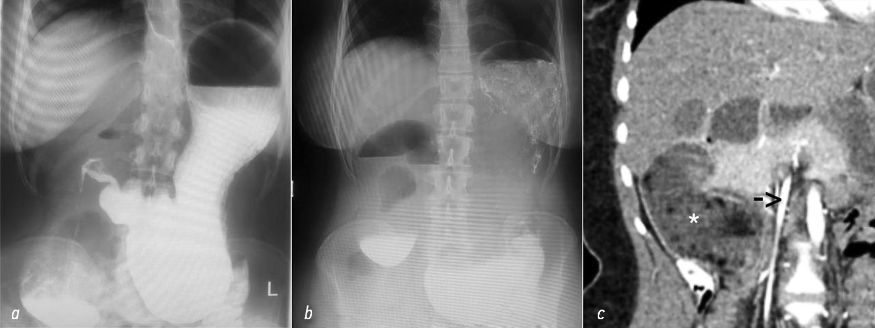 Рис. 3. Исследования желудка и двенадцатиперстной кишки: а — рентгеноскопическое с контрастированием бариевой взвесью; b — обзорное рентгеноскопическое через 1 ч после исследования; с — компьютерная томография органов брюшной полости, отмечается резко расширенная двенадцатиперстная кишка (отмечена звездочкой) справа от верхней брыжеечной артерии (стрелка)