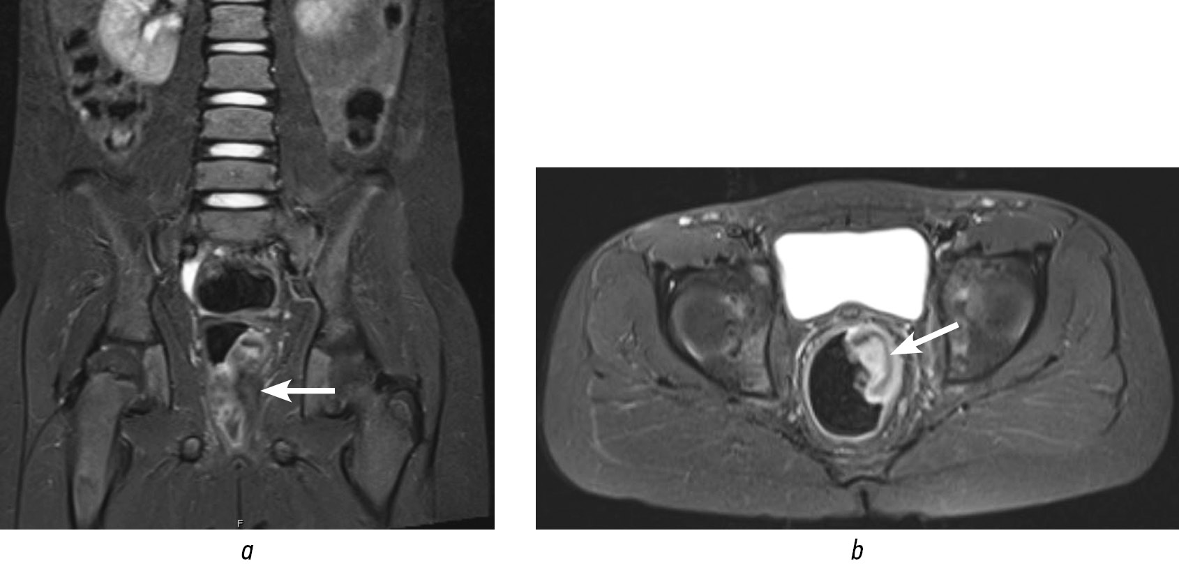 Рис. 1. Магнитно-резонансная томограмма. Фронтальный (а) и поперечный (b) срезы. Визуализируется образование прямой кишки, суживающее просвет (указано стрелкой).
