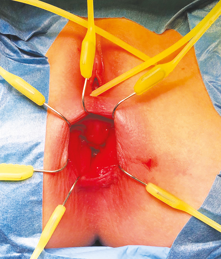 При осмотре под наркозом в ректальных зеркалах (октябрь 2021 г.) визуализирован стеноз анального канала и опухолевидное образование по передней стенке прямой кишки, выполнена биопсия образования и бужирование анального стеноза (до размера бужа № 15). По результатам гистологического исследования: данных о наличии опухолевого процесса нет, грануляционная ткань. Проведен курс местной противорубцовой и противовоспалительной терапии (свечи с гиалуронидазой и лидокаином). По результатам магнитно-резонансной томографии (МРТ) малого таза в ноябре 2021 г. диагностирован стеноз в анальном канале, выявлено образование по передней стенке анального канала в подслизистом отделе, а также визуализирован интерсфинктерный свищ без гнойного затека. Была инициирована генно-инженерно-биологическая терапия препаратами анти-ФНО. Самочувствие девочки улучшилось, однако сохранялся повышенный уровень ФК (800–1800 мкг/г).