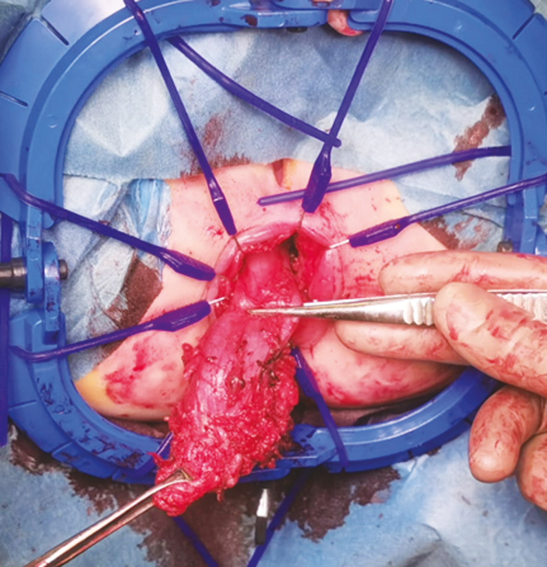 Лапароскопический этап включал мобилизацию прямой кишки с рассечением париетальной брюшины и пересечением сосудов. На промежностном этапе выполнен циркулярный разрез прямой кишки на уровне дистальной границы опухоли, с помощью моно- и биполярной коагуляции проведена мобилизация дистального отдела прямой кишки на протяжении 7–8 см (рис. 3). Прямая кишка низведена и резецирована, сформирован ректоанальный анастомоз.