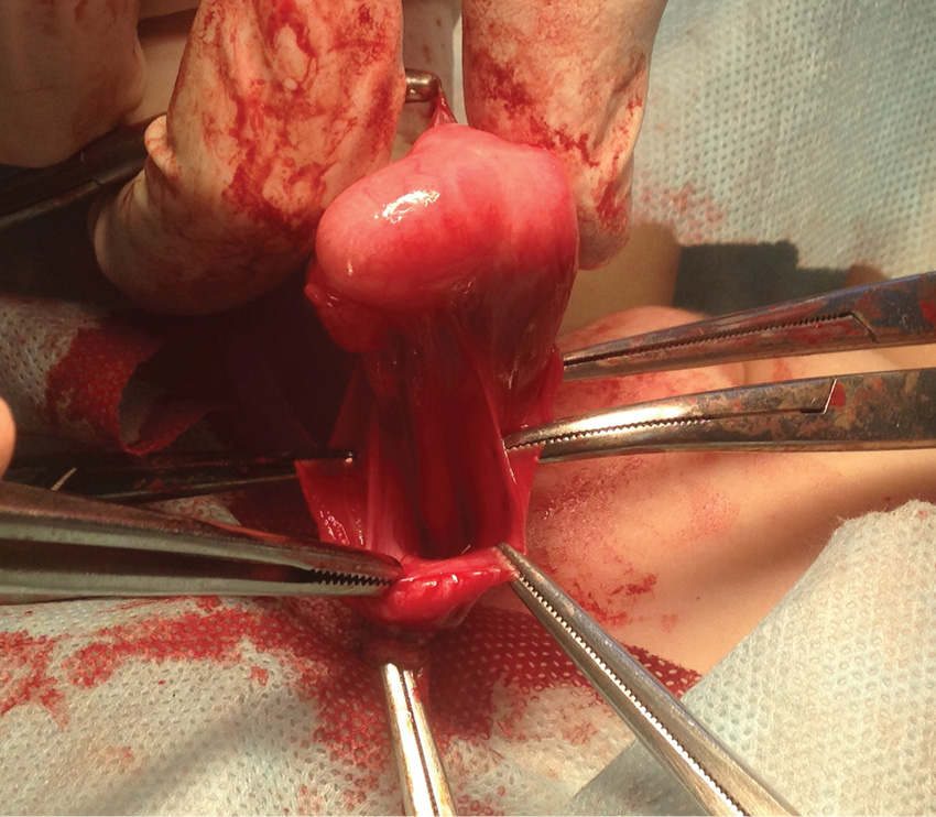 27 марта 2015 г. пациент в плановом порядке взят в операционную для выполнения грыжесечения с обеих сторон. Интраоперационно: под внутривенной анестезией после обработки операционного поля стандартным способом произведен разрез кожи в правой паховой области длиной до 2,5 см, у наружного пахового кольца обнаружен грыжевой мешок. Последний 3,5 × 2,0 × 2,5 см, выделен, вскрыт, содержимым мешка является яичко 1,6 × 1,6 × 1,0 см с придатком и семявыносящим протоком (рис. 1).