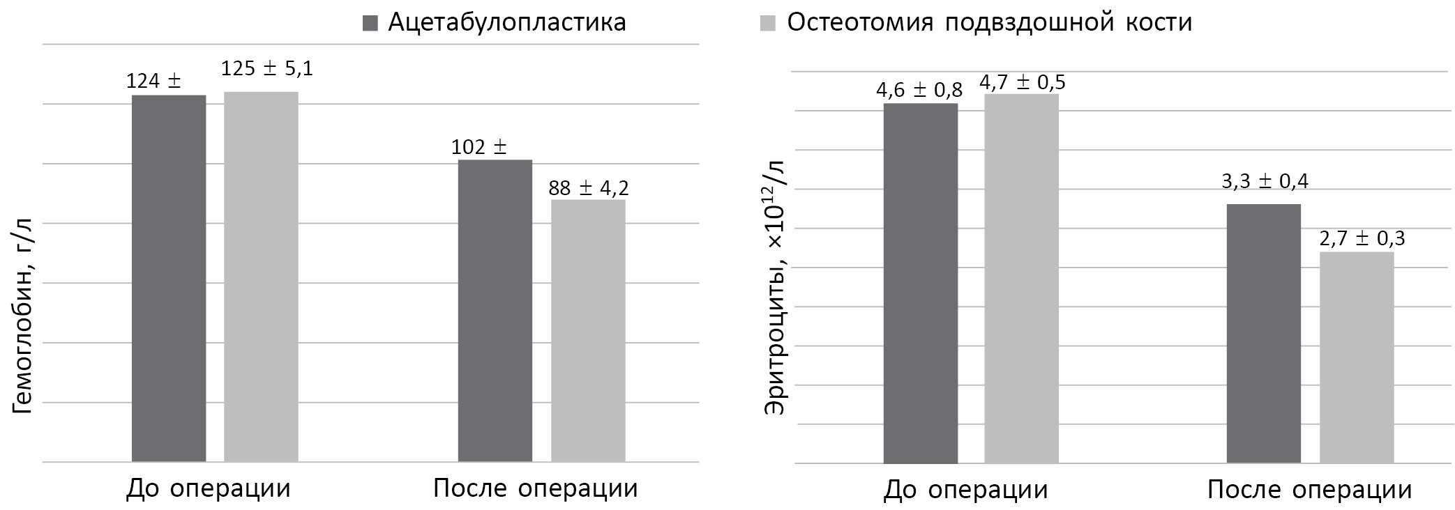Результаты. Как показывает наше исследование, выполнение остеотомии подвздошной кости требовало достоверно большего времени, чем ацетабулопластика (р = 0,0088 (p < 0,05)). Кроме того, выполнение остеотомии подвздошной кости сопровождалось более выраженным снижением уровня как гемоглобина, так и количества эритроцитов в крови, чем при выполнении ацетабулопластики.