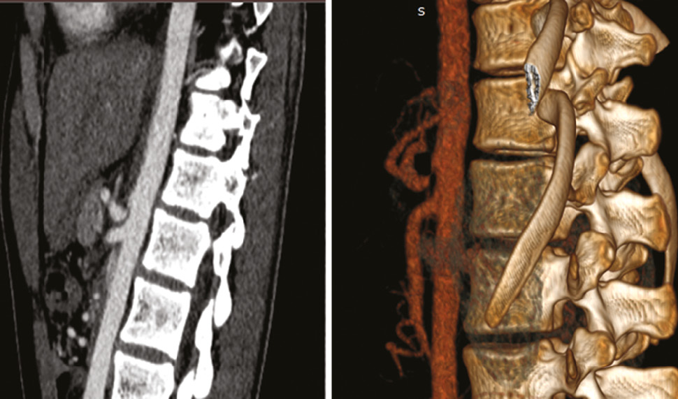 Рис. 1. Компьютерная томография с 3D-реконструкцией компрессионного стеноза чревного ствола